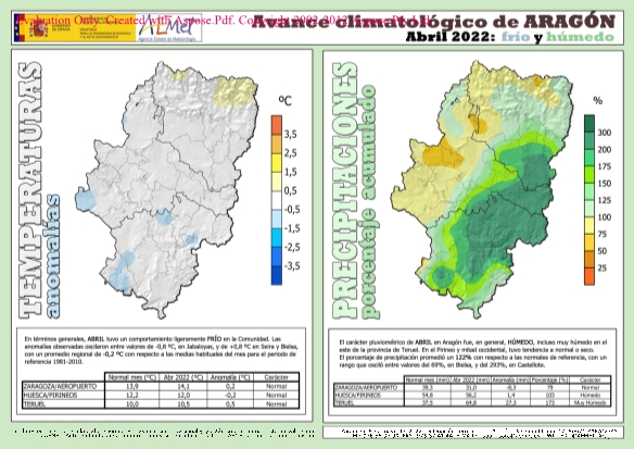 El caracter pluviométrico de abril en Aragón fue, en general, húmedo, incluso muy húmedo en el este de la provincia de Teruel. En el Pirineo y mitad occidental, tuvo tendencia a normal o seco. El porcentaje de precipitación promedió un 122% con respecto a las normales de referencia, con un rango que osciló entre valores del 69%, en Bielsa, y del 293%, en Castellote.