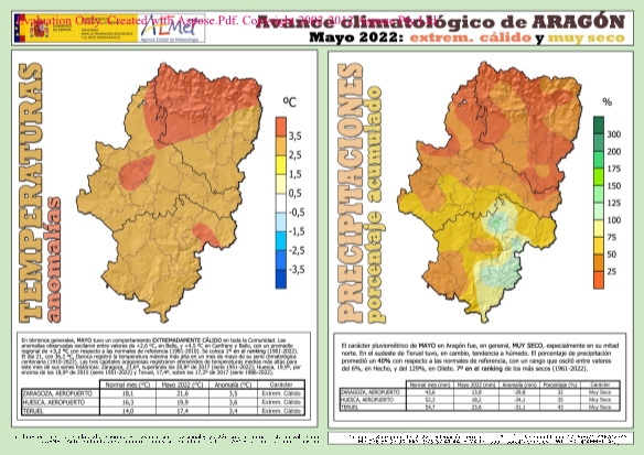 En términos generales, mayo tuvo un comportamieto extremadamento cálido en todo Aragón. Las anomalías observadas oscilaron entre valores de +2,6 ºC con respecto a las normales de referencia (1981-2010). Se coloca 1º en el ranking (1961-2022). El día 21, con 36,2 ºC, Daroca registró la temperatura más alta en un mes de mayo de su serie climatológica centenaria (1910-2022). Las tres capitales aragonesas registraron efemérides de temperaturas medias más altas para este mes de sus series históricas: Zaragoza, 21,6 ºC, superando los 20,8 ºC de 2017 (serie 1951-2022); Huesca, 19,9 ºC, por encima de los 18,9 ºC de 2015 (serie 1951-2022) y Teruel, 17,4 ºC, sobre los 17,2 ºC de 2017 (serie 1986-2022).