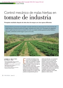 Resultados de ensayos durante siete años para el control de malas hierbas en tomate de industria con cinco aperos diferentes: cepillo de eje horizontal, escardador de torsión, escardador de dedos, grada de varillas flexibles y quemador. En todos los ensayos se sembró la variedad de tomate Perfectpeel, plantada en mayo y las labores mecánicas se realizaron 15 días después.