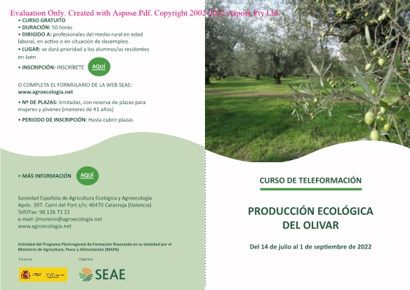 El olivo es el principal cultivo en superficie en la producción ecológica de España. Sin embargo, la oferta formativa principalmente presencial no es muy grande y requiere mayor diversificación. En SEAE existen diversos especialistas que trabajando desde hace años sobre el olivar ecológico, que han acumulado experiencias en este campo y que ahora se ponen a disposición de los operadores y agricultores ecológicos.