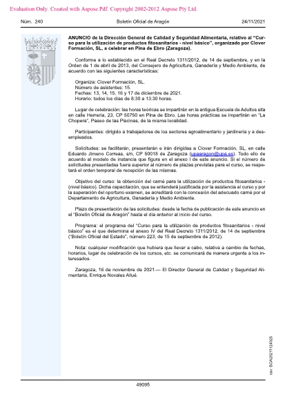 Solicitudes: se facilitarán, presentarán e irán dirigidas a Clover Formación, SL, en calle Eduardo Jimeno Correas, s/n, CP 50018 de Zaragoza (upaaragon@upa.es). Todo ello de acuerdo al modelo de instancia que figura en el anexo I de este anuncio. Si el número de solicitudes presentadas fuera superior al número de plazas previstas para el curso, se respetará el orden temporal de recepción de las mismas.