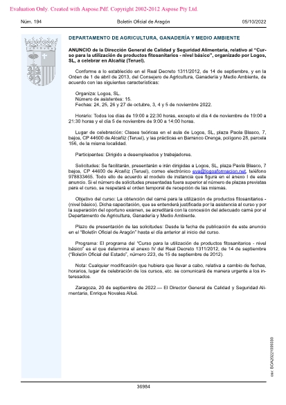 Solicitudes: Se facilitarán, presentarán e irán dirigidas a Logos, SL, plaza Paola Blasco, 7 bajos, CP 44600 de Alcañiz (Teruel), correo electrónico eva@logosformacion.net, teléfono 978833465. Todo ello de acuerdo al modelo de instancia que figura en el anexo I de este anuncio. Si el número de solicitudes presentadas fuera superior al número de plazas previstas para el curso, se respetará el orden temporal de recepción de las mismas.