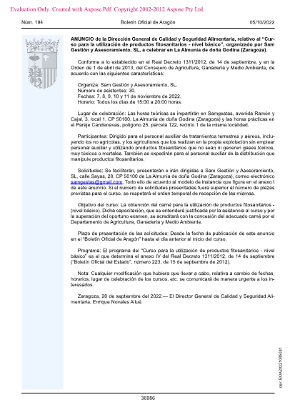 Lugar de celebración: Las horas teóricas se impartirán en Samgestas, avenida Ramón y Cajal, 3, local 1, CP 50100, La Almunia de doña Godina (Zaragoza) y las horas prácticas en el Paraje Candenavas, polígono 25, parcela 122, recinto 1 de la misma localidad.