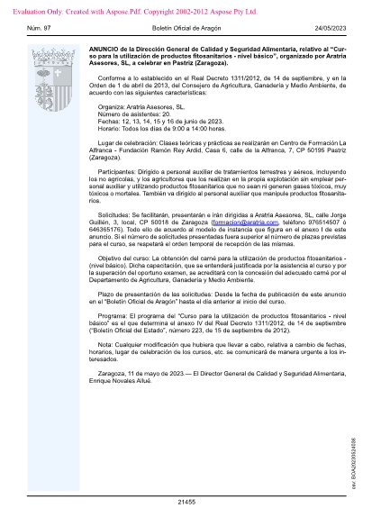 Solicitudes: Se facilitarán, presentarán e irán dirigidas a Aratria Asesores, SL, calle Jorge Guillén, 3, local, CP 50018 de Zaragoza (formacion@aratria.com, teléfono 976514507 ó 646365176). Todo ello de acuerdo al modelo de instancia que figura en el anexo I de este anuncio. Si el número de solicitudes presentadas fuera superior al número de plazas previstas para el curso, se respetará el orden temporal de recepción de las mismas.