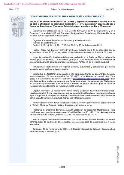 Lugar de celebración: Las horas teóricas se realizarán en el Salón de Plenos del Ayuntamiento, plaza de España, 1, 50540 Borja (Zaragoza). Las horas prácticas se celebrarán en Cooperativa Agrícola Borja (explanada), carretera de Ainzón, 2, de la misma localidad.