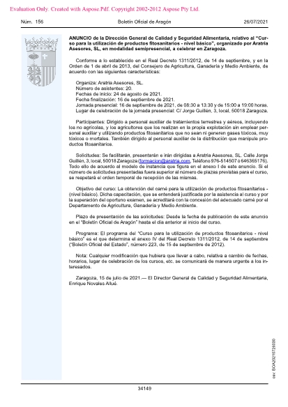 Solicitudes: Se facilitarán, presentarán e irán dirigidas a Aratria Asesores, SL. Calle Jorge Guillén, 3, local, 50018 Zaragoza (formacion@aratria.com, Teléfono 976-514507 ó 646365176). Todo ello de acuerdo al modelo de instancia que figura en el anexo I de este anuncio. Si el número de solicitudes presentadas fuera superior al número de plazas previstas para el curso, se respetará el orden temporal de recepción de las mismas.