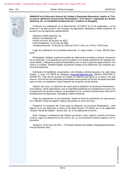Solicitudes: Se facilitarán, presentarán e irán dirigidas a Aratria Asesores, SL, calle Jorge Guillén, 3, local, CP 50018 de Zaragoza (formacion@aratria.com, teléfono 976514507 ó 646365176). Todo ello de acuerdo al modelo de instancia que figura en el anexo I de este anuncio. Si el número de solicitudes presentadas fuera superior al número de plazas previstas para el curso, se respetará el orden temporal de recepción de las mismas.