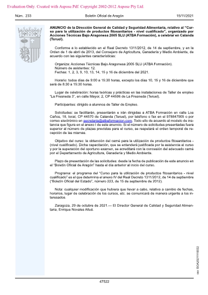 Solicitudes: se facilitarán, presentarán e irán dirigidas a ATBA Formación en calle Los Caños, 18, local, CP 44570 de Calanda (Teruel), por teléfono o fax en el 978847905 o por correo electrónico en secretaria@atbaformacion.com. Todo ello de acuerdo al modelo de instancia que figura en el anexo I de este anuncio. Si el número de solicitudes presentadas fuera superior al número de plazas previstas para el curso, se respetará el orden temporal de recepción de las mismas.