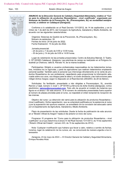 Solicitudes: Se facilitarán, presentarán e irán dirigidas a Prevensystem, SL, avenida Ramón y Cajal, número 3, local 1, CP 50100 La Almunia de doña Godina (Zaragoza), correo electrónico: salonso@prevensystem.com. Todo ello de acuerdo al modelo de instancia que figura en el anexo I de este anuncio. Si el número de solicitudes presentadas fuera superior al número de plazas previstas para el curso, se respetará el orden temporal de recepción de las mismas.