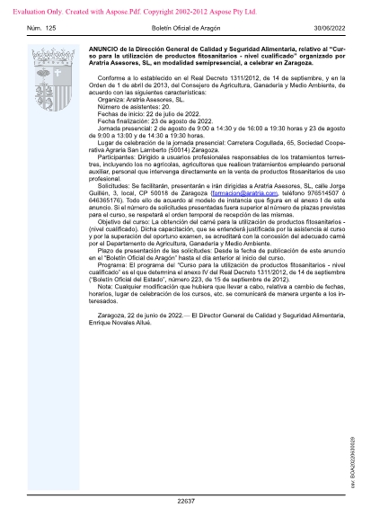 Solicitudes: Se facilitarán, presentarán e irán dirigidas a Aratria Asesores, SL, calle Jorge Guillén, 3, local, CP 50018 de Zaragoza (formacion@aratria.com, teléfono 976514507 ó 646365176). Todo ello de acuerdo al modelo de instancia que figura en el anexo I de este anuncio. Si el número de solicitudes presentadas fuera superior al número de plazas previstas para el curso, se respetará el orden temporal de recepción de las mismas.