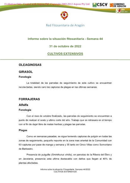 Informe semanal sobre la situación fitosanitaria de los Cultivos Extensivos en Aragón. Semana 44/2022