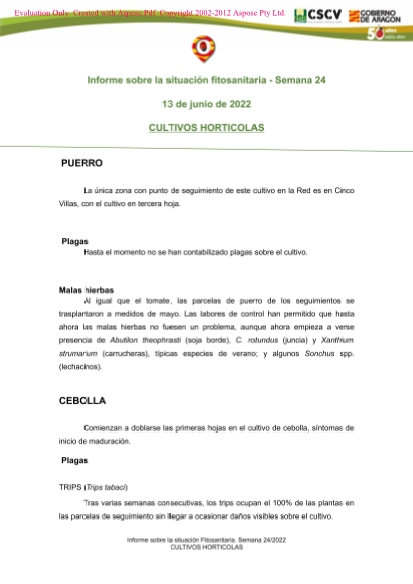 Informe semanal sobre la situación fitosanitaria de los Cultivos Hortícolas en Aragón. Semana 24/2022