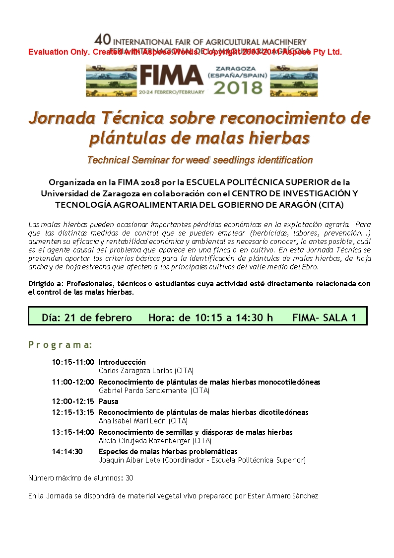 Organizada el miércoles 21 de febrero de 10:15 a 14:30 en la Sala 1 de la FIMA 2018 en Zaragoza por la ESCUELA POLITÉCNICA SUPERIOR de la Universidad de Zaragoza en colaboración con el CITA.