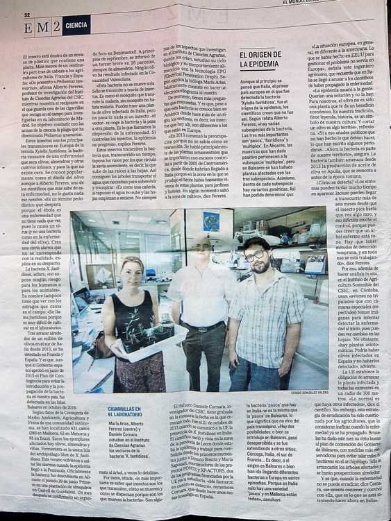 Artículo publicado en el periódico "El Mundo" sobre los trabajos que se llevan a cabo en el Instituto de Ciencias Agrarias (CSIC) de Madrid sobre los vectores de transmisión de la Xylella fastidiosa, concretamente Philaenus spumarius.