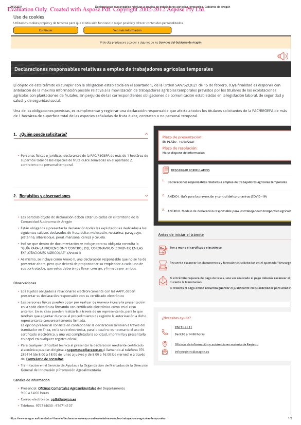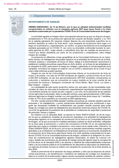 ORDEN SAN/52/2021, de 15 de febrero, por la que se adoptan determinadas medidas excepcionales en relación con la campaña agrícola 2021 para hacer frente a la crisis sanitaria ocasionada por la pandemia COVID-19 en la Comunidad Autónoma de Aragón.
