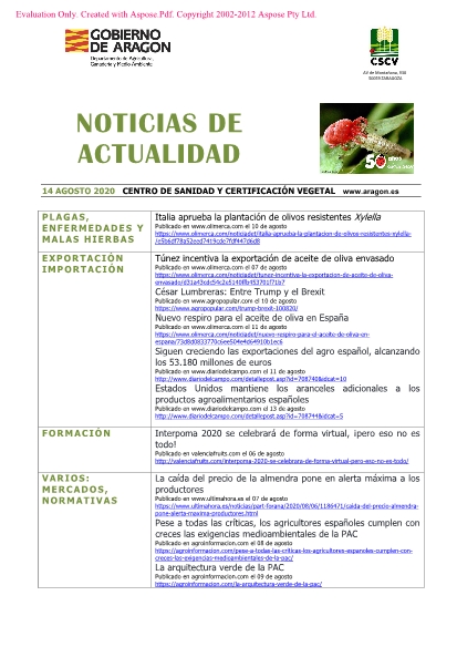 14 de agosto de 2020. Recopilación semanal de noticias sobre agricultura.