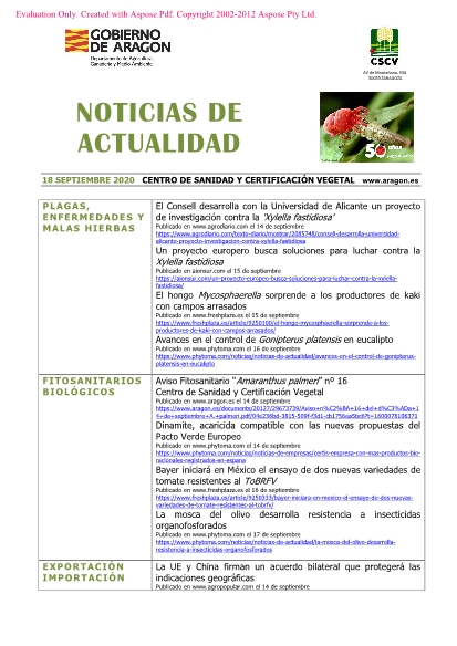 18 de septiembre de 2020. Recopilación semanal de noticias sobre agricultura.