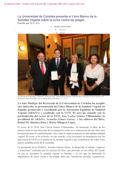 La Sala Mudéjar del Rectorado de la Universidad de Córdoba ha acogido este miércoles la presentación del Libro Blanco de la Sanidad Vegetal en España, promovido y coordinado por la Asociación Española de Sanidad Vegetal (AESaVe) y coeditado con la UCO.
