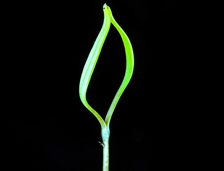 Detalle de los cotiledones lineales. Planta de la familia de las Apiáceas o Umbelíferas.
