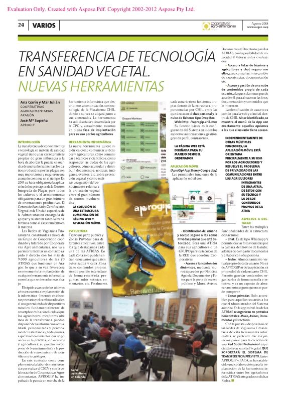 Cooperativas agro-alimentarias, ha publicado en la contraportada de su periódico "Aragón.coop" (Nº 42, agosto 2018, en formato papel y digital) un completo e interesante reportaje sobre "Aprogip" en el que se pone de relieve la importancia que las nuevas tecnologías tienen en el sector agrícola y se reconocen la importancia del trabajo que "Aprogip" tiene como Red Social Profesional, centrada principalmente en la promoción de la Gestión Integrada de Plagas (GIP), poniendo en contacto con los profesionales como técnicos y agricultores, aportando documentos, informaciones técnicas, noticias de actualidad, realización de eventos, alertas de sanitarios ... de esta manera, nuestra asociación, la página web y la aplicación móvil, apuesta por un modelo de agricultura 2.0, que sin duda redundará en beneficio del agricultor.