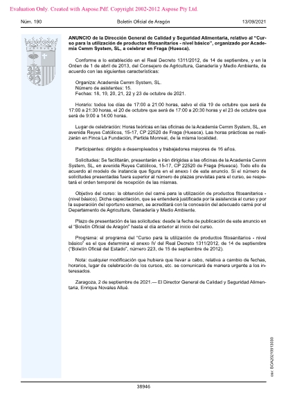 Lugar de celebración: Horas teóricas en las oficinas de la Academia Cemm System, SL, en avenida Reyes Católicos, 15-17, CP 22520 de Fraga (Huesca). Las horas prácticas se realizarán en Finca La Fundación, Partida Monreal, de la misma localidad.