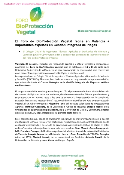 A 1 mes de la celebración del I Foro de BioProtección Vegetal , (organizado por el COITAVC en colaboración con Phytoma) donde se abordará "El control Biológico en la Gestión Integrada de Plagas en Cultivos Mediterráneos".