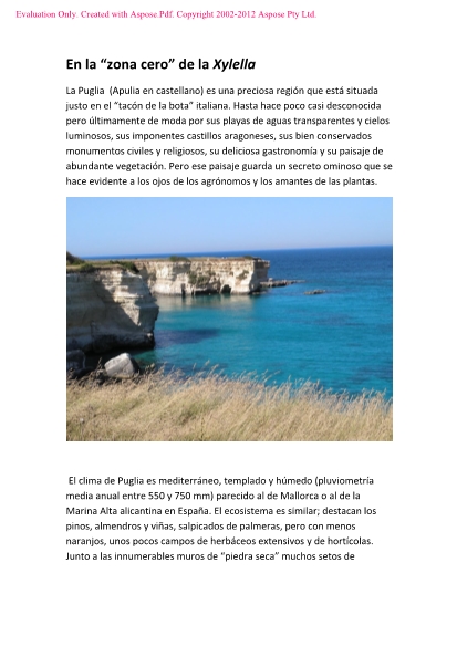 En este documento se presentan las impresiones de Carlos Zaragoza, exjefe de la Unidad de Sanidad Vegetal del CITA, en su recorrido por la Puglia, región del sur de Italia, que fue la primera europea en detectar focos de Xylella fastidiosa en el olivar en 2013.