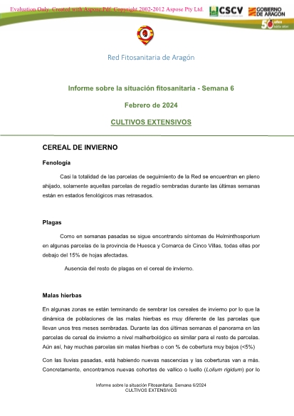 Informe semanal sobre la situación fitosanitaria de los Cultivos Extensivos en Aragón. Semana 6/2024