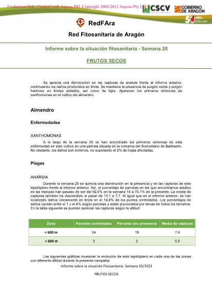 Informe semanal sobre la situación fitosanitaria de los Frutos Secos en Aragón. Semana 20/2023