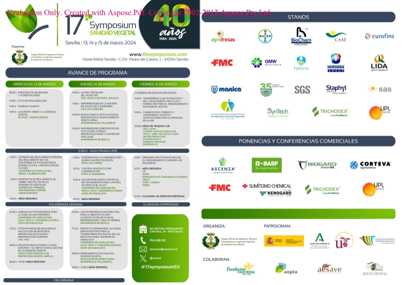 Los nuevos marcos regulatorios y las técnicas genómicas, las soluciones innovadoras frente a plagas y enfermedades en olivar, almendro, fresa o aguacate, el uso de la inteligencia artificial y el cuaderno digital de explotación agraria son los temas que protagonizarán el programa del 17º Symposium de Sanidad Vegetal, que se celebra del 13 al 15 de marzo de 2024 en el Centro de Convenciones del Hotel Meliá Sevilla.