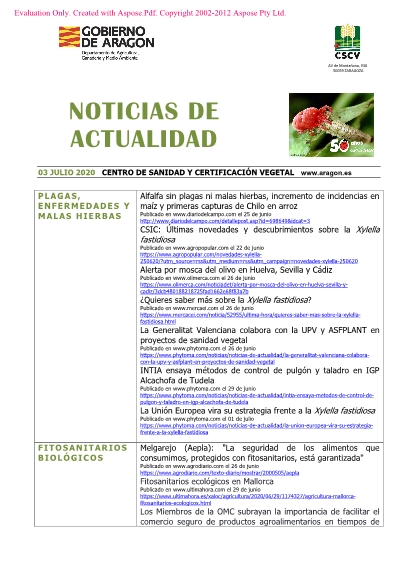 Noticias * Frutales Insectos Bacterias Normativa europea Normativa autonómica Malas hierbas Agricultura ecológica Agricultura de conservación Formación Fitosanitarios de síntesis Almendro Olivo Vid * Cereales de invierno Trigo Alfalfa Arroz Maíz * Hortícolas Melocotonero * Otras hortícolas
